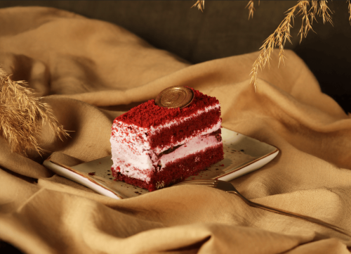 Prăjitură din pandişpan roșu, cremă din brânză mascarpone, umplutură de fructe și cheesecake cu cremă de brânză și umplutură de fructe gelificate.