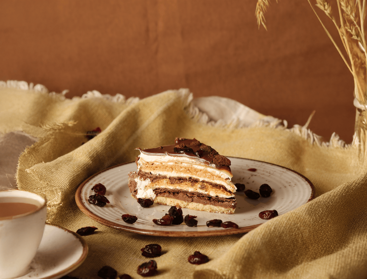 Prăjitură din aluat foitaj cu cacao, foi de napolitană, cremă de vanilie, cremă din lapte condensat caramelizat cu smântână și ganaș din ciocolată cu lapte.
