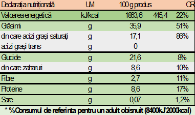 nuci caju (28,4%), ulei de cocos, lămâie proaspătă, apă potabilă, miere de albine, curmale uscate, făină de migdale, arahide, merișoare uscate, unt de arahide [arahide (95%), unt de cacao, ulei vegetal (rapiță, soia), sare de mare], alune, pudră din floare de clitoria ternate (0,3%), mentă uscată, spirulina (0,1%), aromă: vanilină. Conține: nuci caju, migdale, arahide, alune, soia. Poate conține urme de miez de nuci, fistic.