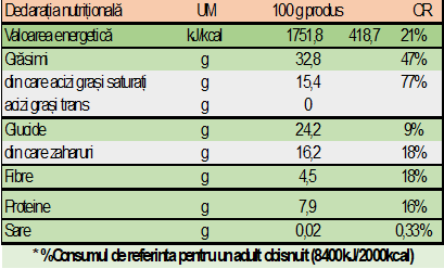 Nuci caju (25,2%), curmale uscate, apă potabilă, ulei de cocos, căpșune (7,8%), banane, miez de nucă, fulgi de cocos, arahide, smochine uscate, stafide, caise uscate, pudră de roşcove, alune, migdale, semințe de chia, goji uscate, spirulină (0,2%), boia de ardei dulce, ghimbir uscat, scortișoară. Conține: nuci caju, nuci, arahide, alune, migdale. Poate conține urme de fistic, susan.