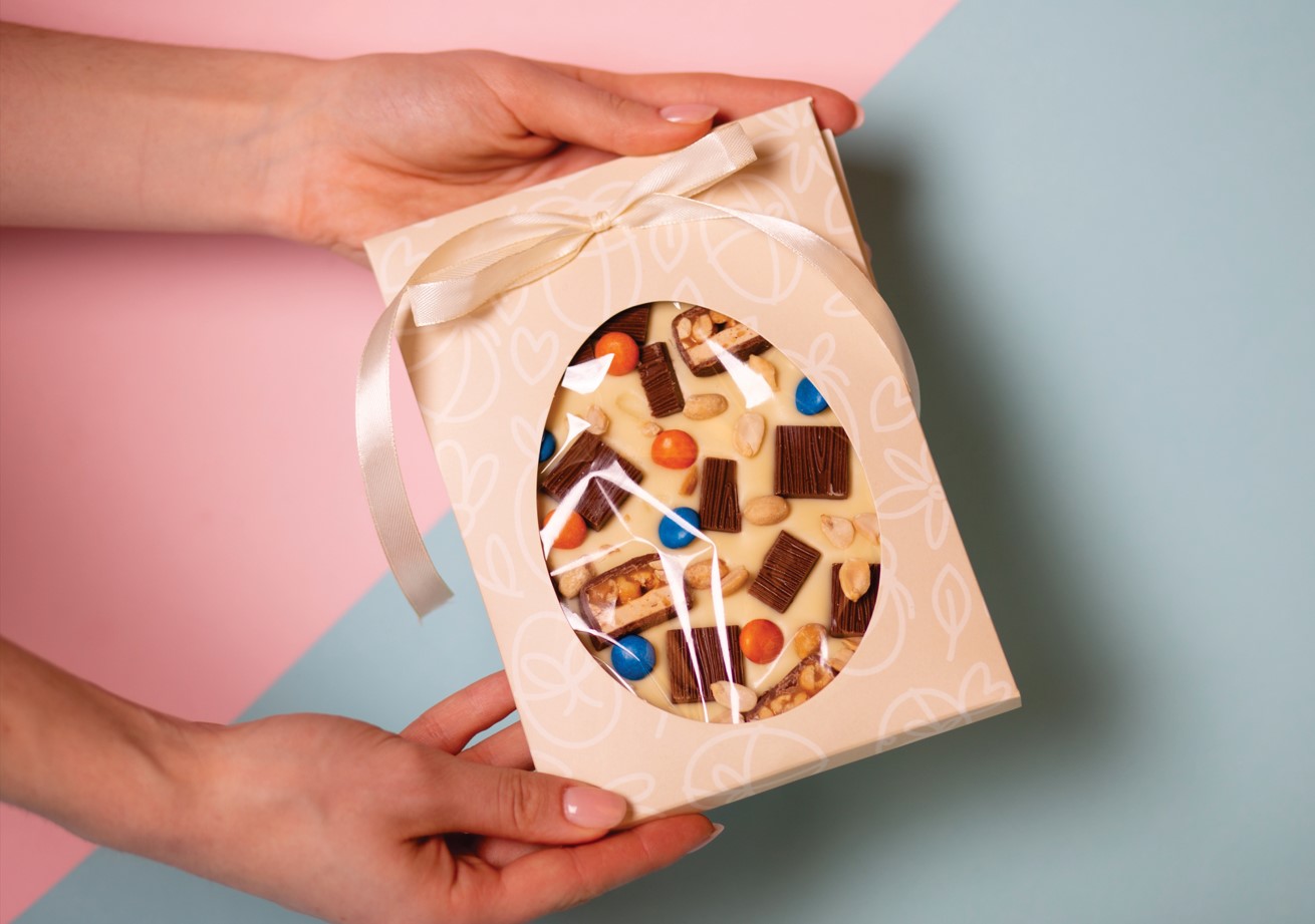 Produs din ciocolată albă naturală și decor din ciocolate și arahide.