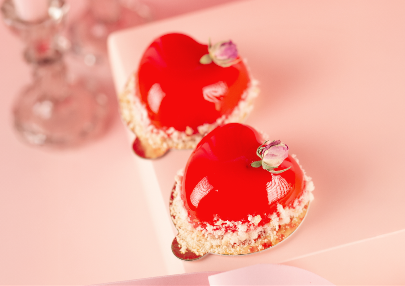Prăjitură din pandișpan alb, mousse de ciocolată albă, caramel și glazură roșie de ciocolată.