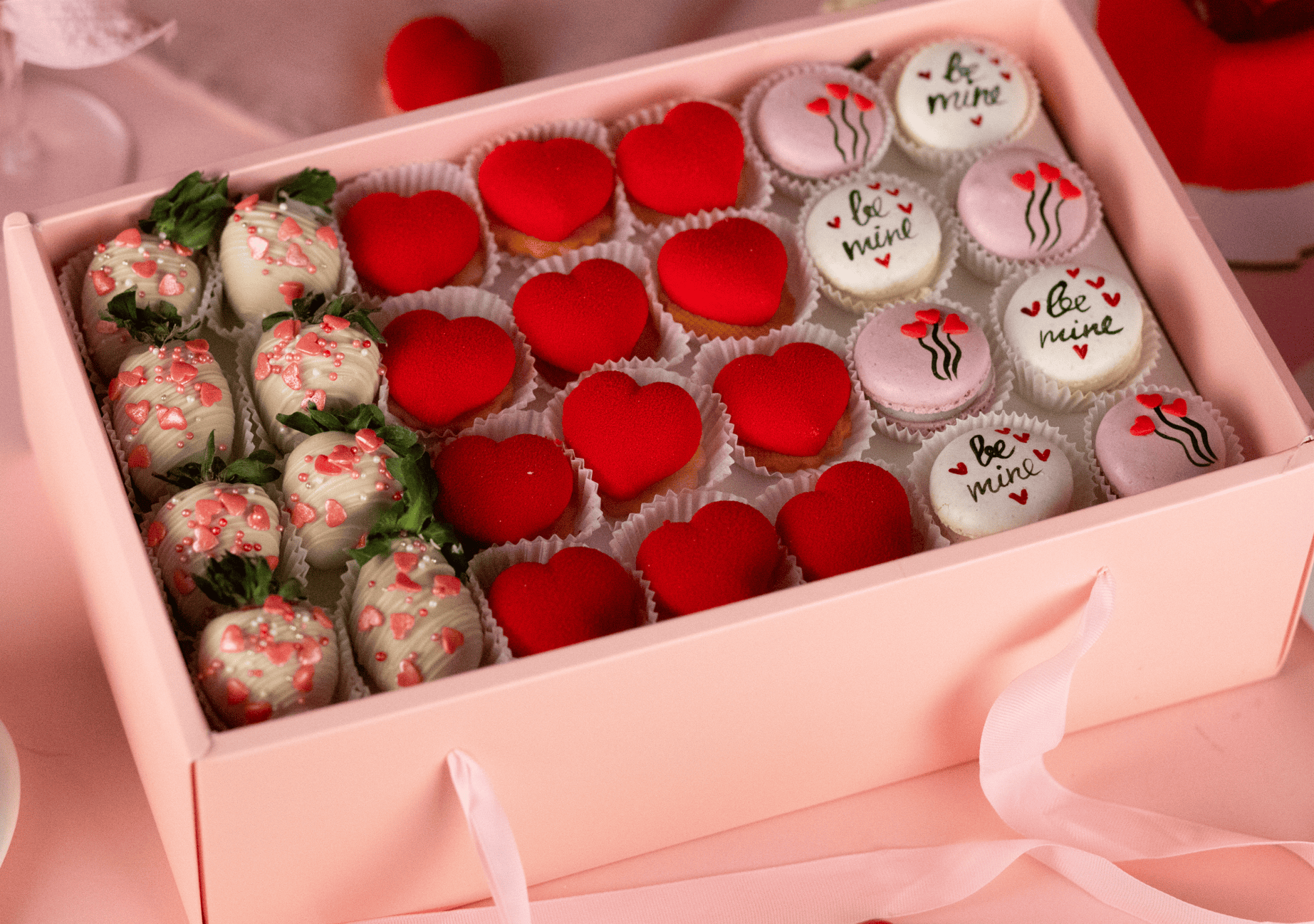 Set pentru îndrăgostiți, 570g Mini prăjitură din biscuit cu unt, mousse de cocos și piure de zmeură gelificat; căpșune învelite în ciocolată și macarons cu cremă de ciocolată naturală belgiană. MDL 687,00 La comandă
