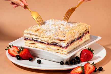 Tartă din aluat sfărâmicios cu umplutură de coacăză și ciocolată.