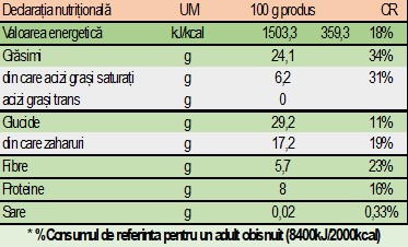 Apă potabilă, nuci caju, migdale, fructe uscate: curmale, merişoare, smochine, caise; ulei de cocos, portocale proaspete, semințe de susan, semințe de chia, miez de nucă, alune, pudră de roșcove, fulgi de cocos, fistic, semințe de dovleac, spirulină. Conține: nuci caju, migdale, susan, nuci, fistic, alune. Poate conține urme de arahide. *Notă: Ingredientele marcate prin text îngroșat conțin substanțe ce pot cauza alergii sau intoleranțe alimentare.