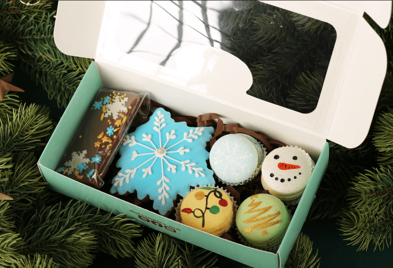 Set din ciocolată cu lapte, macarons în asortiment si turtă dulce.